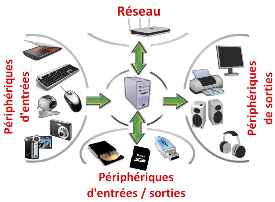 On peut classer généralement les périphériques en deux types : les périphériques d'entrée et les périphériques de sortie. Les périphériques d'entrée servent à fournir des informations au système informatique : clavier, souris, scanner, micro, webcam, etc. Les périphériques de sortie servent à faire sortir des informations du système informatique : écran, imprimante, haut-parleur, etc. On peut également rencontrer des périphériques d'entrée-sortie qui opèrent dans les deux sens : un lecteur de CD-ROM ou une clé USB, par exemple, permettent de stocker des données. Une autre catégorie peut être ajoutée à ce dernier type, il s'agit des périphériques multifonctions comme un caméscope qui fait office d'appareil photo, de webcam, et de disque externe, ou encore d'une imprimante qui fait aussi office de scanner.