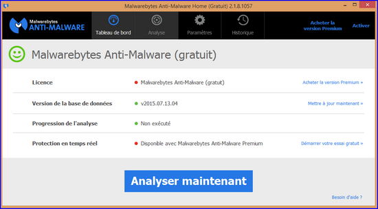 Malwarebytes Anti-Malware est un logiciel gratuit et efficace qui protège votre système contre les logiciels malveillants. Note : Malwarebytes Anti-Malware est entièrement gratuit, mais la version Premium (non indispensable à l'efficacité du logiciel) est proposée en essai pour 30 jours. Vous pourrez la décocher lors de l'installation ou refuser la version Premium après la période d'essai. Ce logiciel a reconnu tous les échantillons de test, neutralisé tous les composants actifs, supprimé les fichiers superflus, réparé tous les dommages et il a restitué un système Windows entièrement nettoyé lors des 60 cas testés par AV-TEST.